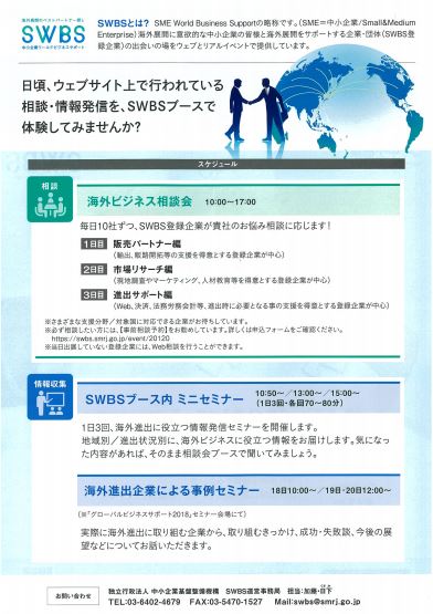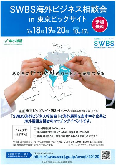 7月18日(水)~7月20日(金)で開催される、SWBS海外ビジネス相談会in東京ビッグサイト(全日程10時~17時)にサイエスト株式会社が参加します。